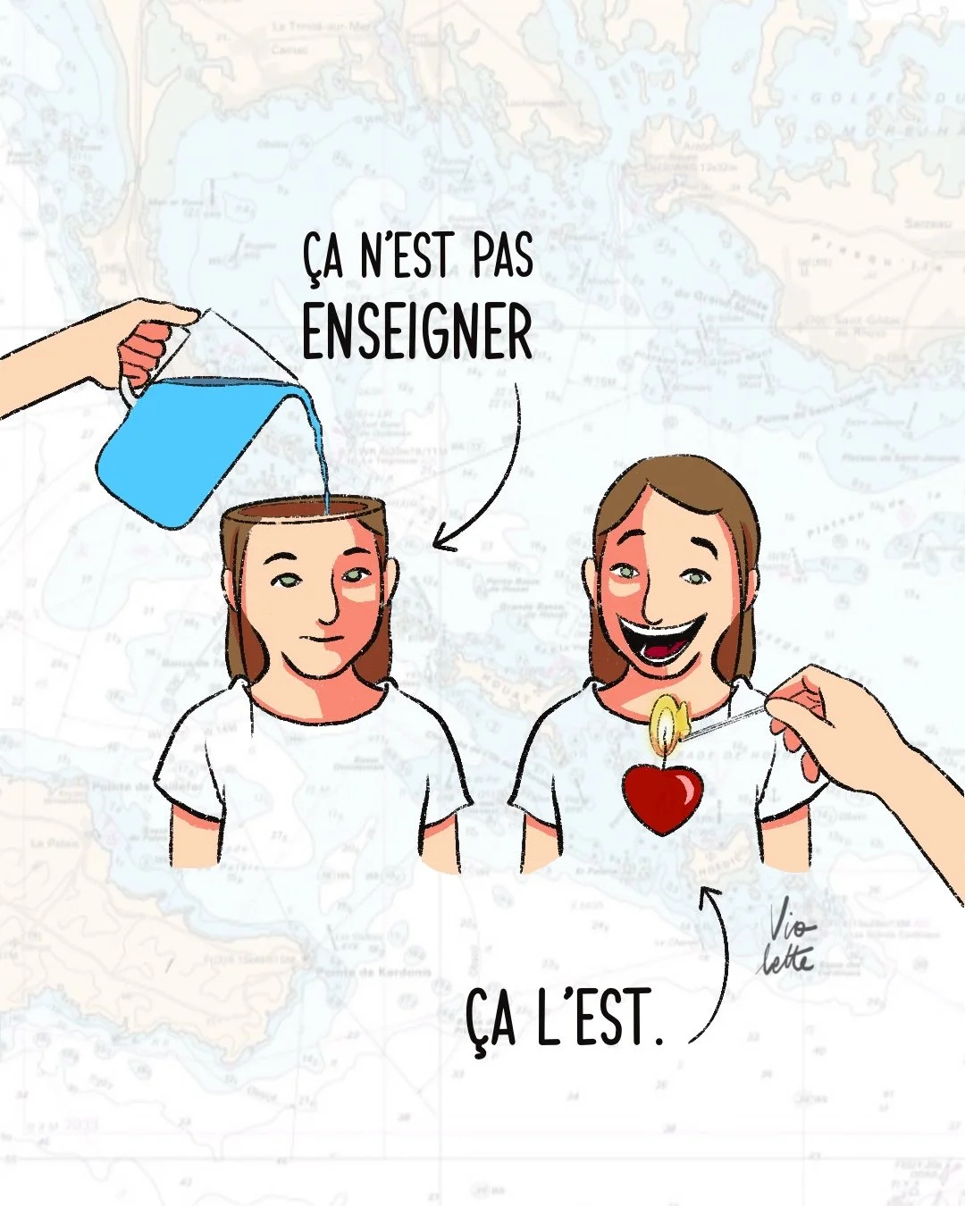 Commençons par ma vision de l'éducation, retranscrite dans ce dessin. Elle me parle beaucoup, car je fonctionne ainsi. J'ai besoin d'un feu passionnel pour travailler, sinon... je périclite. Pas toi ?